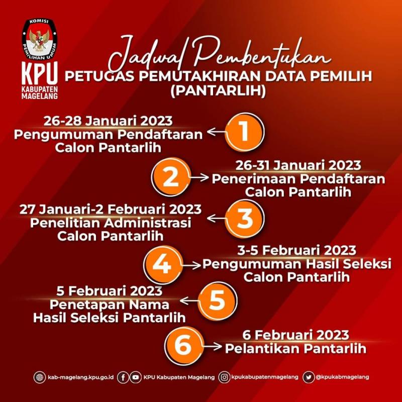 Pada hari Kamis, (26/01/2023) KPU Kabupaten Magelang telah membuka calon pendaftaran Petugas Pemuktahiran Data Pemilih (PANTARLIH) untuk pemilu 2024. PANTARLIH juga bisa disebut dengan Kelompok Penyelenggara Pemungutan Suara yang selanjutnya dapat disebut KPPS. Pendaftaran dimulai pada tanggal 26 Januari - 31 Januari 2023. Adapun syarat utama bagi calon pendaftar diantaranya WNI, usia minimal 17 tahun, dan tidak menjadi anggota partai politik paling singkat 5 tahun. Calon pendaftar nantinya akan ditempatkan di domisili masing-masing desa/keluruhan. Jumlah penerimaan kuota PANTARLIH setiap desa/kelurahan berbeda-beda tergantung jumlah TPS nya karena nantinya 1 orang akan memegang 1 TPS, di Desa Bumiharjo sendiri jumlah yang diterima 8 orang. Untuk detail persyaratan dan informasi lengkap dapat langsung menghubungi Panitia Pemungutan Suara (PPS) di kantor Desa/Kelurahan setempat. Berikut adalah link berisi informasi dan dokumen yang dapat diakses sebagai kelengakapan syarat pendaftaran serta timeline kegiatan digambar yang diupload.